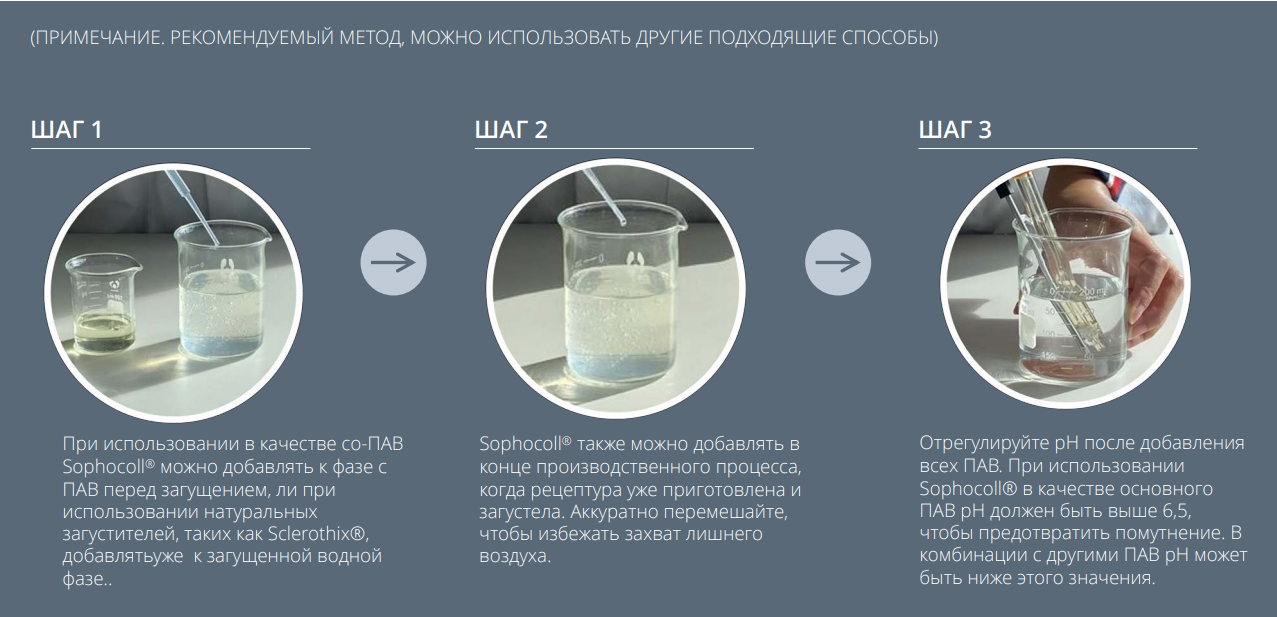 Sophocoll® совместим с холодным способом введения, легко диспергируется, стабилен в широком диапазоне рецептур, подходит для мицеллярной воды, шампуней, гелей для душа, пенок для умывания и средств для волос.